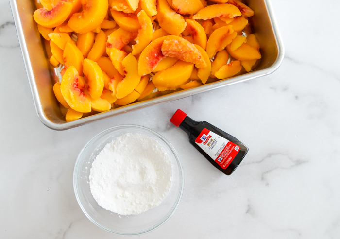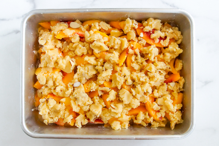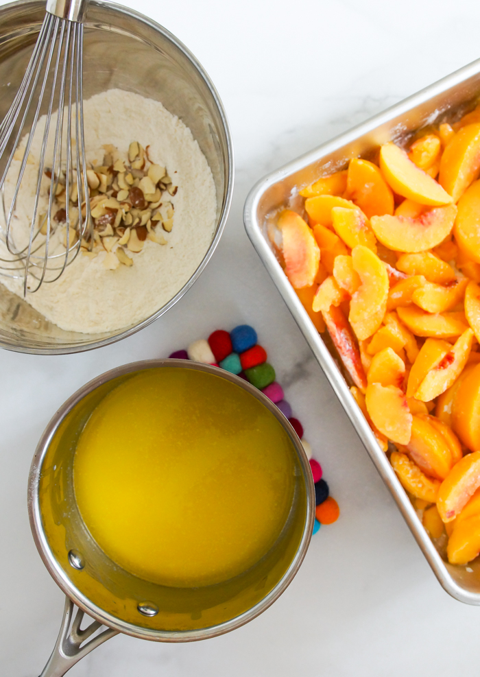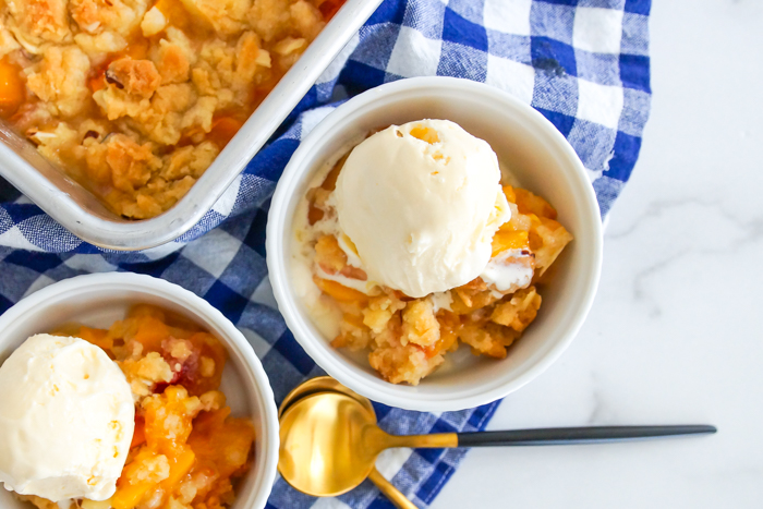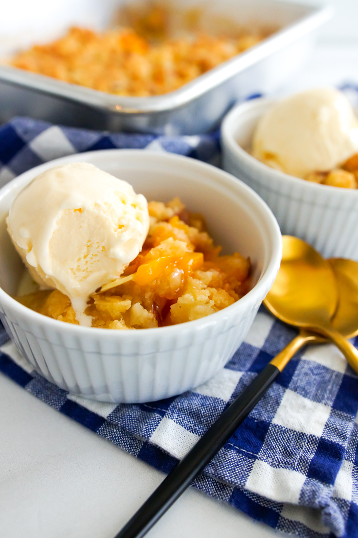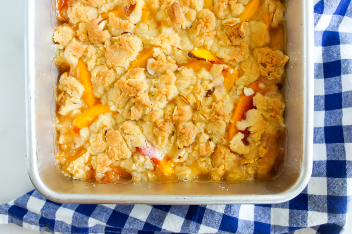 Based on the vintage recipe calling for canned fruit and cake mix, this updated, from-scratch version features frozen peaches, almond flavors, a homemade cake mix layer, and sliced almonds for a bit of crunch. Melted butter stirred together with the dry ingredients ensures there will be no dry patches. Oh, and the vanilla ice cream on top is mandatory.