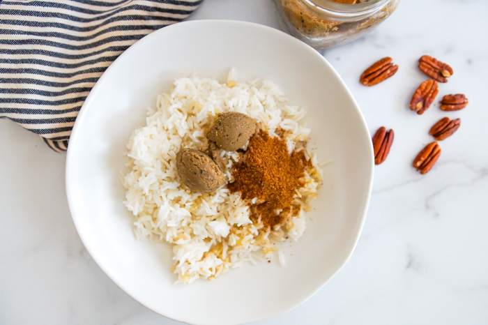 - rice (brown or white or a combo). This is a great time to use those Trader Joe’s microwave rice bags or heat up leftover rice. If your tummy isn’t used to eating a big bowl of whole grains, I’d start with white rice or a combination of white and brown