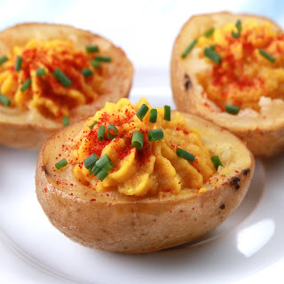 - Scoop out a small section of the potatoes to create a bowl. (You can add these to the hummus center, or simply snack on them now!)