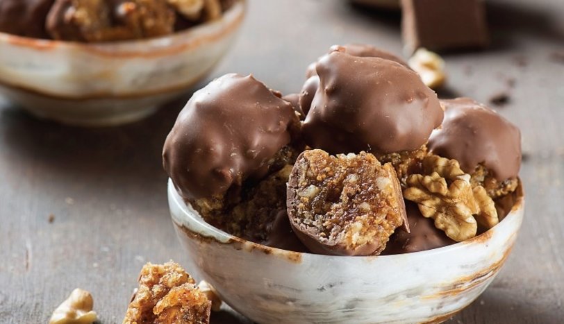 Chop the figs coarsely and put them in a bowl. Add the remaining ingredients and knead. Take walnut-sized pieces from the mortar and shape them into a round shape. Arrange on a baking sheet lined with baking paper and bake in a preheated 165 degree oven for 15-20 minutes. Set aside to cool. For the top, melt the chocolate in a double boiler. Dip the freezing cookies in chocolate with two forks and remove them on baking paper. Serve after freezing.