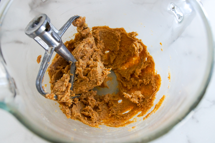 Cream together the butter and sugar until smooth and fluffy. Add in the egg and vanilla and beat until well combined, scraping down the bowl as needed. Beat in the pumpkin.