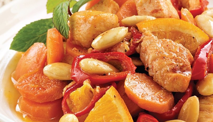 Put the almonds in a small saucepan and add enough cold water to cover it. Put it on the stove and boil for 5 minutes. Then peel them off. Put it dry and place it in a non-stick surface pan and fry it over low heat until the color turns. Take the oil and 2 tablespoons of butter in a pan and add the chicken. Fry for a few minutes and add ground red pepper, salt and black pepper. After a minute or two, add the remaining butter and the carrot, which is diagonally chopped after cleaning. When the carrots are half soft, add the sliced red pepper, the peel, and the sliced orange and almonds. Roast lightly, remove from heat and transfer to an oven dish. Mix the honey with 1 glass of hot water and pour over the food. Cover the container with aluminum foil. Bake in a preheated 180 degree oven for 25 minutes. Take the foil, cook for another 5 minutes and serve.