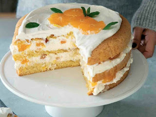 Take the cooked sponge cake from the oven and cut it into 3 pieces after it cools down. Spread the cream between them, sprinkle the dice-cleaned tangerine pieces and net almonds. Complete the cake in three layers. Leave it in the refrigerator for a few hours, then slice it and serve.