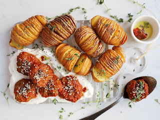 Garnish the meatballs with fresh thyme, sesame seeds and chia seeds and serve with potatoes that come out of the oven.