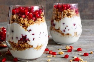How to serve: In each bowl (or a single serving cup), spread a layer of Greek yogurt, then a second layer of pomegranate seeds, then a third of granola, a fourth of yogurt, five of pomegranate, and finally a layer of granola.