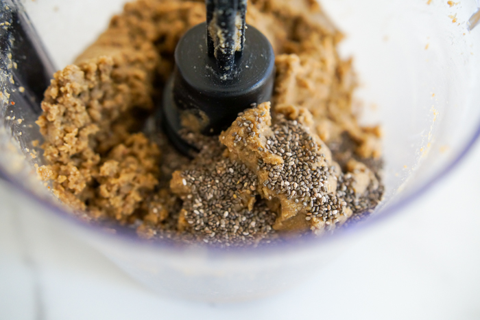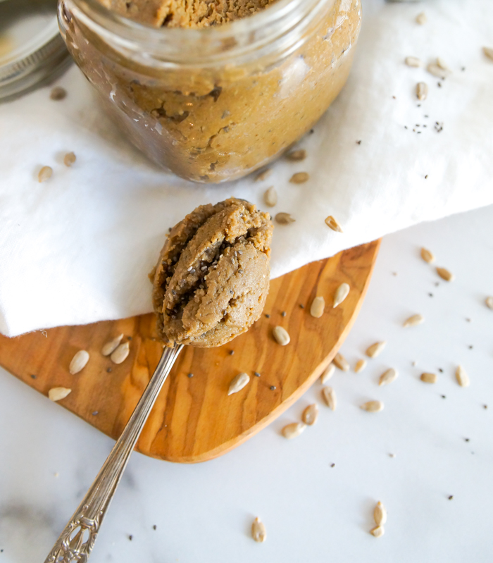 Towards the end, add the chia seeds and pulse to incorporate. I like a thick, scoopable butter. If you like yours looser, keep processing. Scoop into a jar and refrigerate. The sunflower butter is scoopable right out of the fridge. Let it sit a room temperature for several minutes to soften for easier spreading.