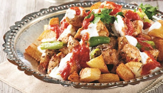 Chop the chicken meat a little larger than the cubes. Take it to the pan with the butter. Add curry, salt, black pepper, chili, cumin and thyme. Saute the chicken meat until it turns color. In the sunflower oil, fry the potatoes, which are diced in large cubes, and then the peppers cut into several pieces. Add chicken on it and mix. Whisk the yogurt and crushed garlic in a bowl. For the tomato sauce, melt the butter and turn the tomato paste several times. Add water and boil. Pour yogurt, then tomato sauce over the chicken kebab and serve hot.